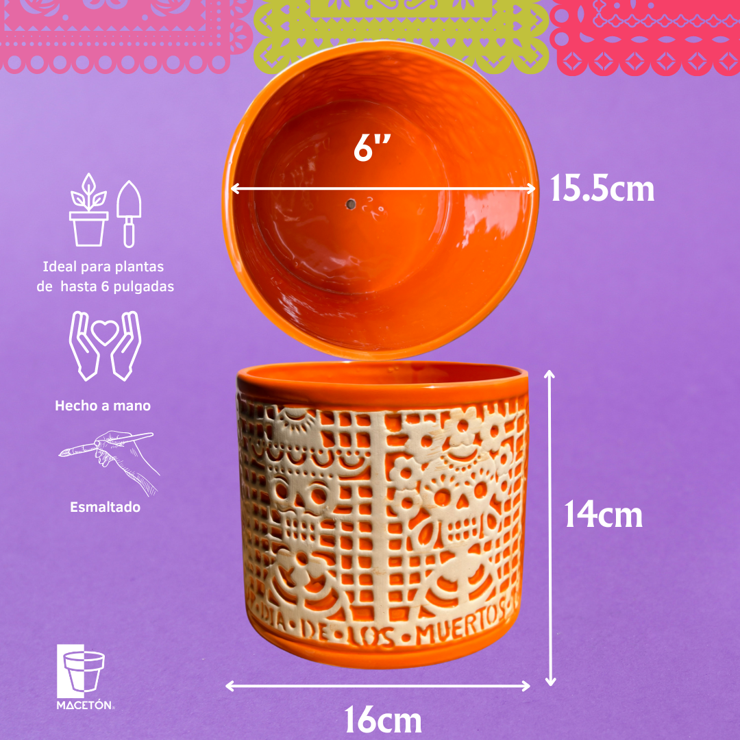 La Maceta de Cerámica Día de Muertos con Diseño de Papel Picado es una pieza única que combina arte y funcionalidad. Su diseño cilíndrico y sus dimensiones, con un diámetro de 15.5 cm en la boca y 16 cm en la base, la hacen ideal para combatir la monotonía en la decoración de interiores o exteriores. Apta para huertas y con agujeros de drenaje, asegura un excelente cuidado para tus plantas, promoviendo un crecimiento saludable.